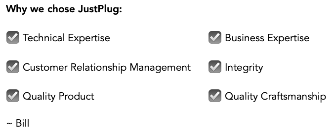 “Our discussion dived straight into tech and business questions. I was impressed by JustPlug’s technical competence, attention to detail, and project management capabilities.” ~ Bill