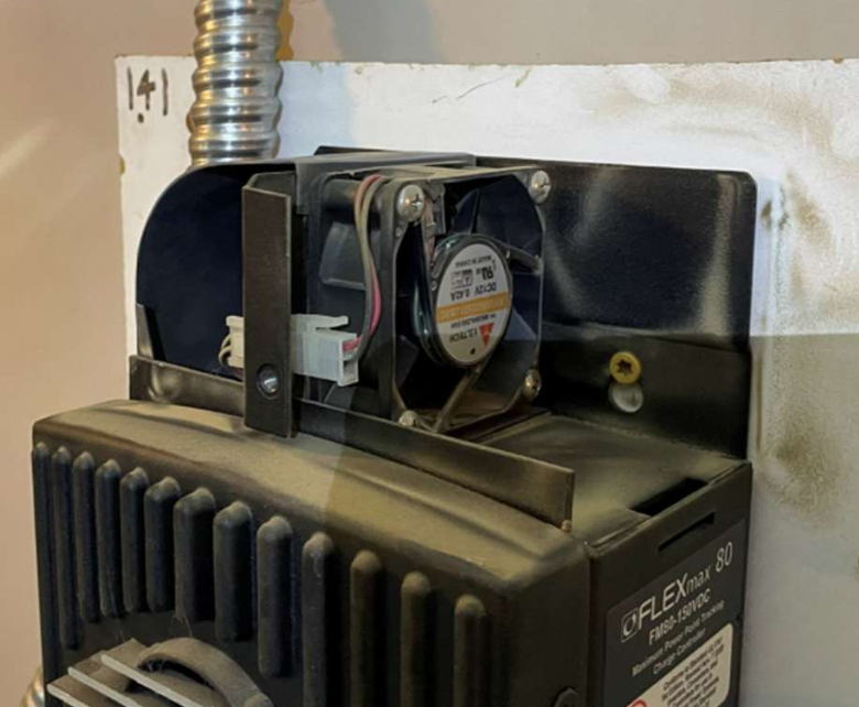 Charge controller fan is covered with dust.