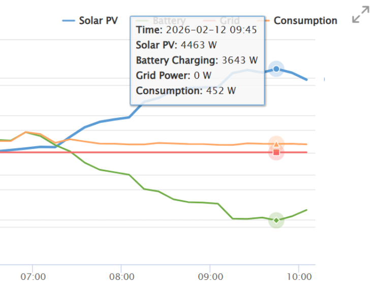 We reviewed various charts generated by the inverter app to track production, usage, and storage. When we saw that the panels performed exceptionally well, so much so that they generated a higher-than-expected voltage, we immediately went on-site to adjust the wiring, moderating the output voltage to ensure long-term safety.